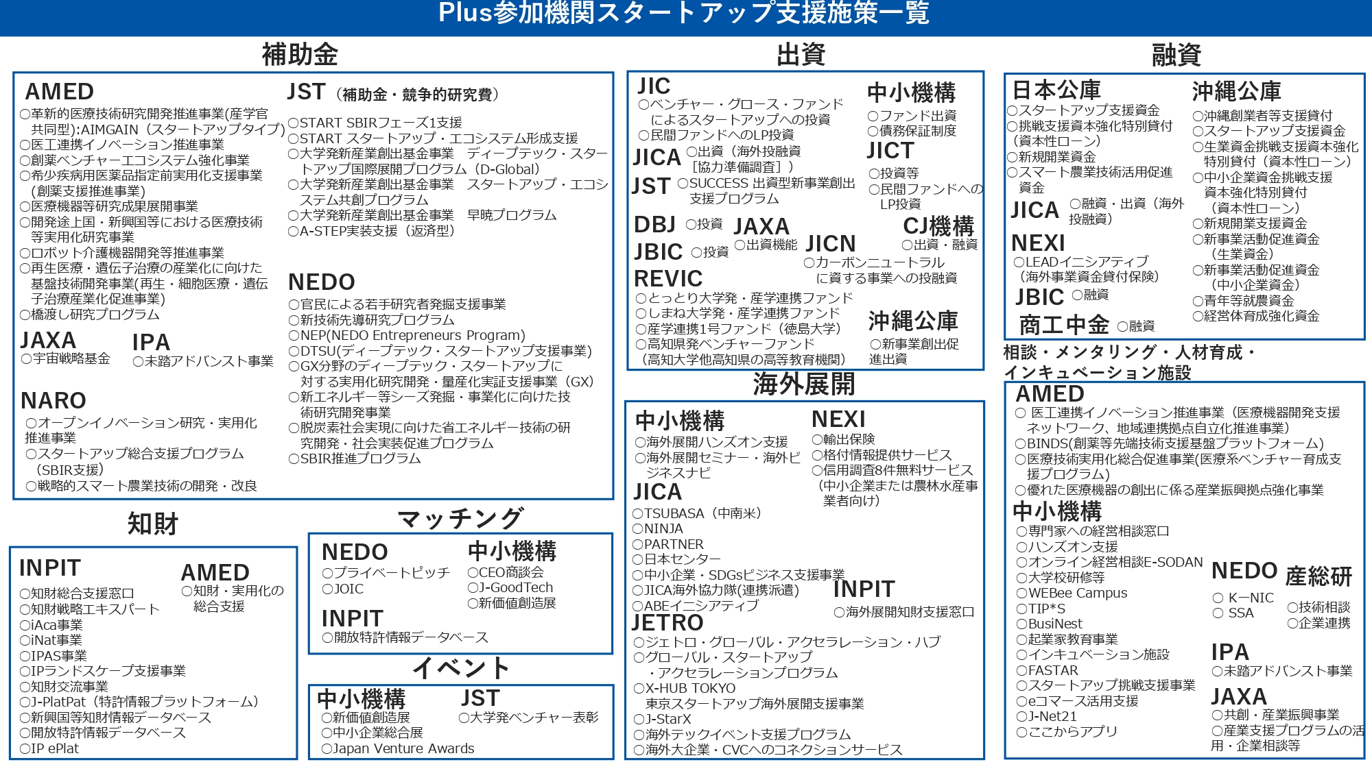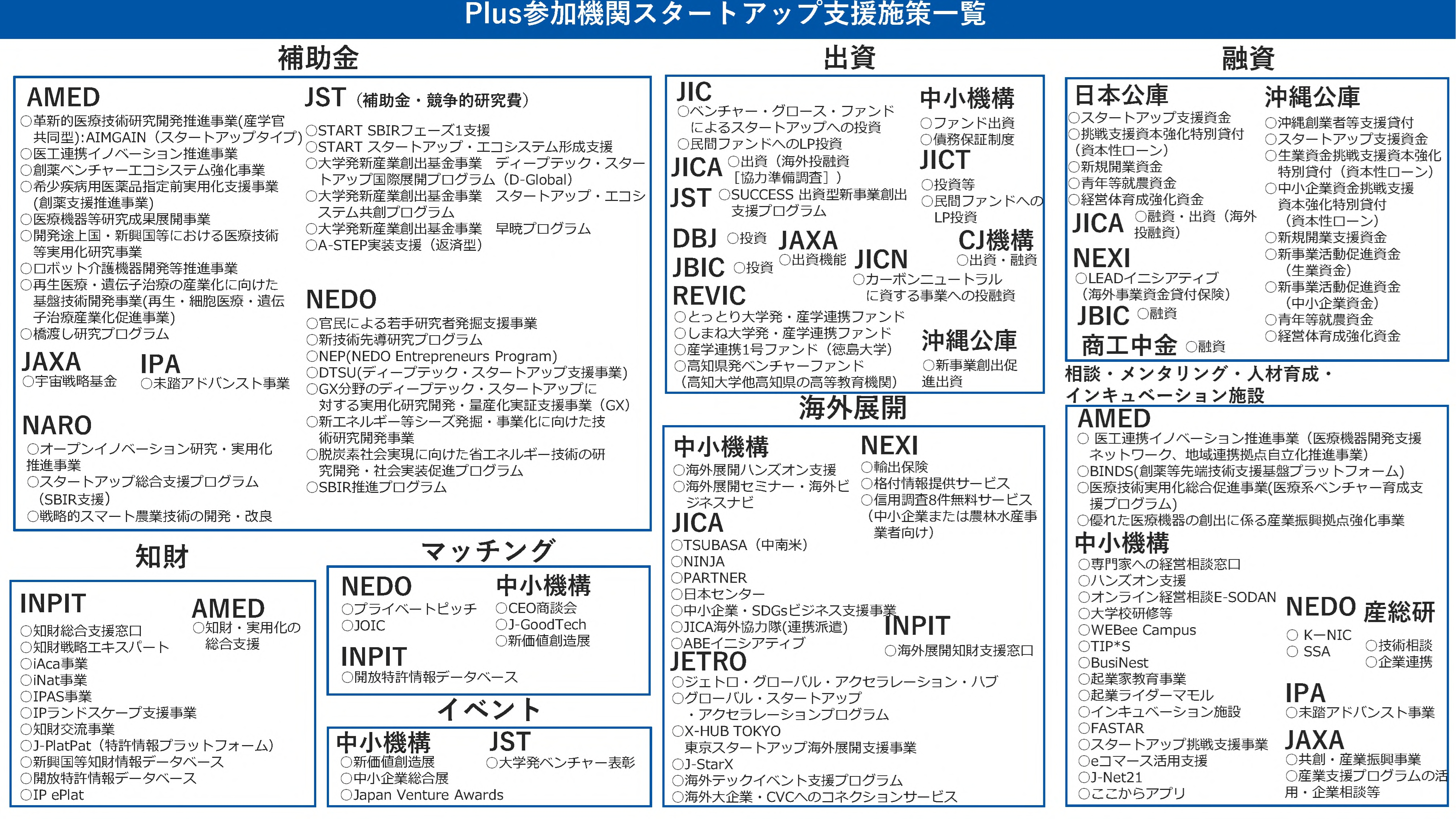 NEDOを含む政府系22機関は、スタートアップ支援を目的として、「スタートアップ・エコシステムの形成に向けた支援に関する協定書」を締結し、スタートアップ支援に関するプラットフォーム(通称Plus(プラス) ”Platform for unified support for startups”)を創設いたしました。