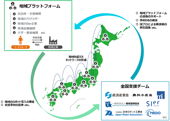 こうした状況を踏まえ、経済産業省、各地域の自治体や支援組織、ロボット関係機関等が連携し、ロボット導入支援の取組を加速させるための協議会である「全国ロボット・地域連携ネットワーク(略称RINGプロジェクト)」を新たに立ち上げることとなりました。