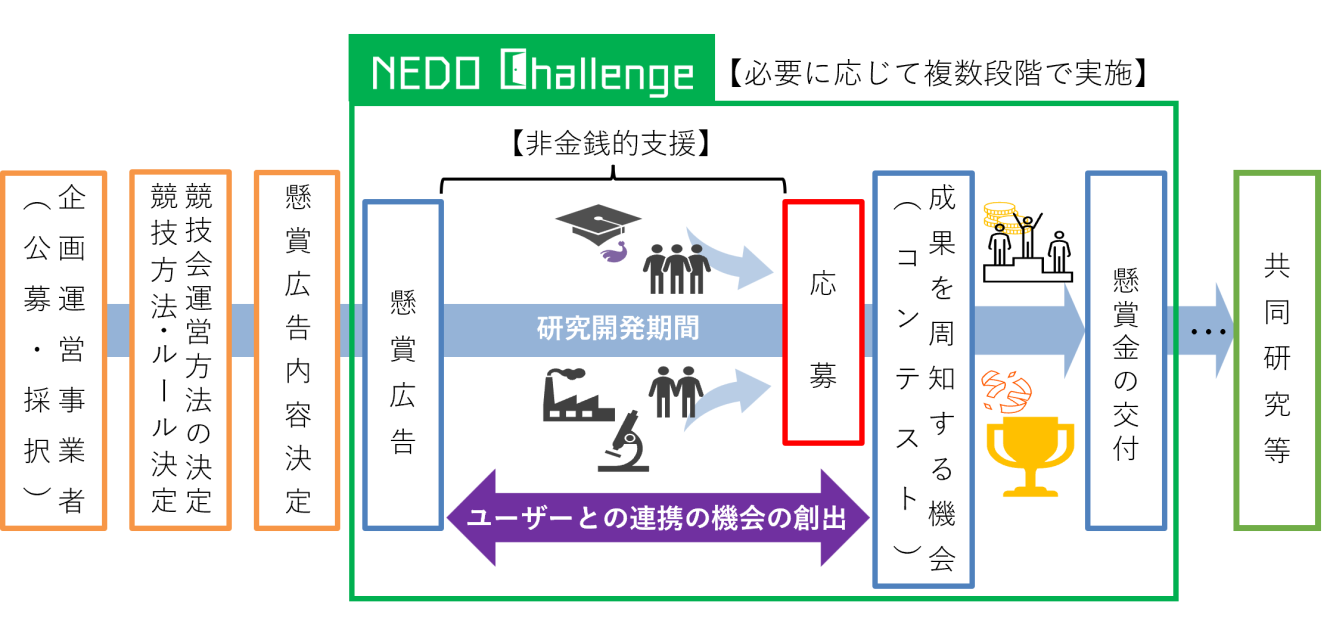 「NEDO懸賞金活用型プログラム」は、技術課題や社会課題の解決に資する多様なシーズ・解決策をコンテスト形式による懸賞金型の研究開発方式を通じて募り、将来の社会課題解決や新産業創出につながるシーズをいち早く発掘することで、共同研究等の機会創出、シーズの実用化、事業化の促進をねらって実施するものです。