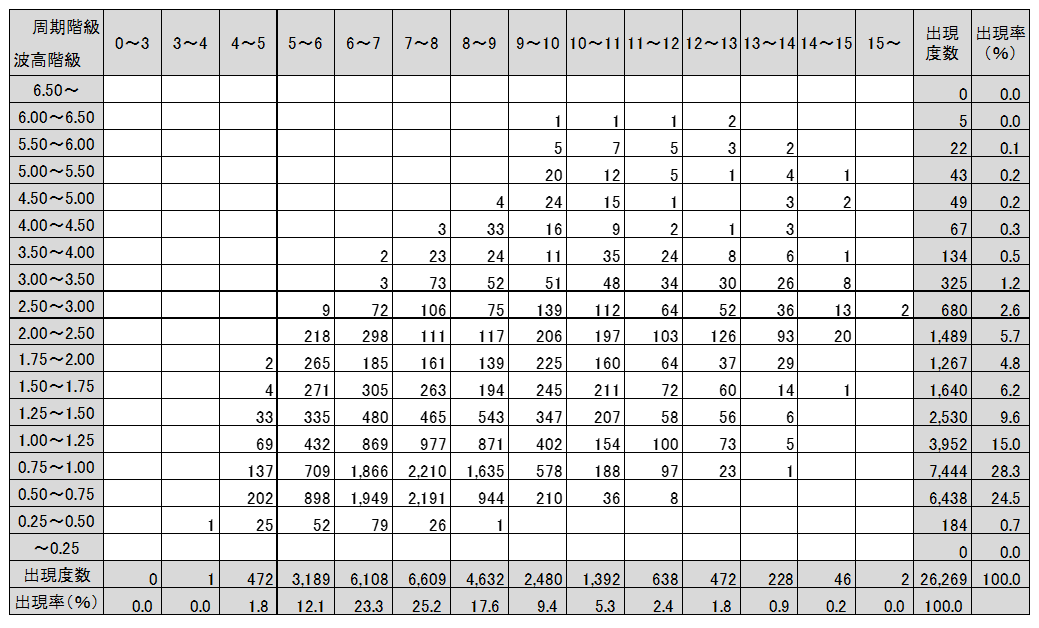 銚子沖洋上観測タワー付近の波高と周期の関係を見ると、有義波高0.50~1.00m、有義波周期6~8秒の出現頻度が最も高い。