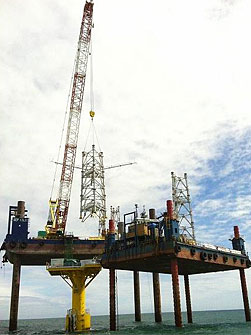 洋上風況観測タワーと洋上風車を設置するため、自己昇降式作業台船(SEP:Self Elevating Platform)が