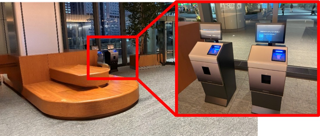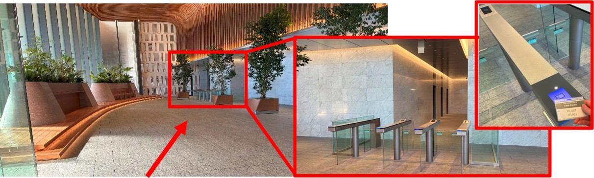 ビル入口から見て左奥、高層階エレベーター用のセキュリティゲートを、〔2〕で発行した入館用ICカードで通過します。