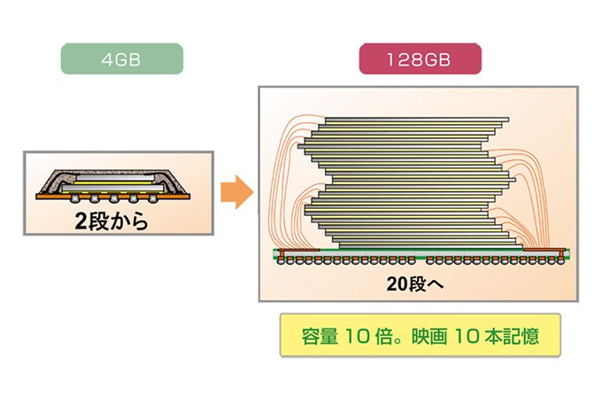 その解決策として登場したのが複数の半導体チップを積み重ねる多段積層化という概念です。平屋の家にこれ以上の数の部屋を作るのは難しいので、マンションのように階数を増やすことで飛躍的な大容量化を実現しようというわけです。