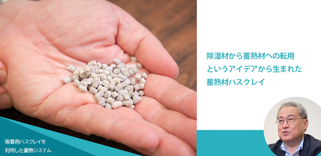 もともとは空調・除湿の吸着材として研究開発されてきたハスクレイでしたが、高砂熱学では、低温で乾燥し水蒸気によって発熱するという性質に着目。これを廃熱利用に応用できないかという発想の転換によって、ハスクレイにまったく新しい利用用途が見出されることになりました。こうしてスタートしたのが、ハスクレイを蓄熱材として利用した吸着材蓄熱システムの開発プロジェクトです。