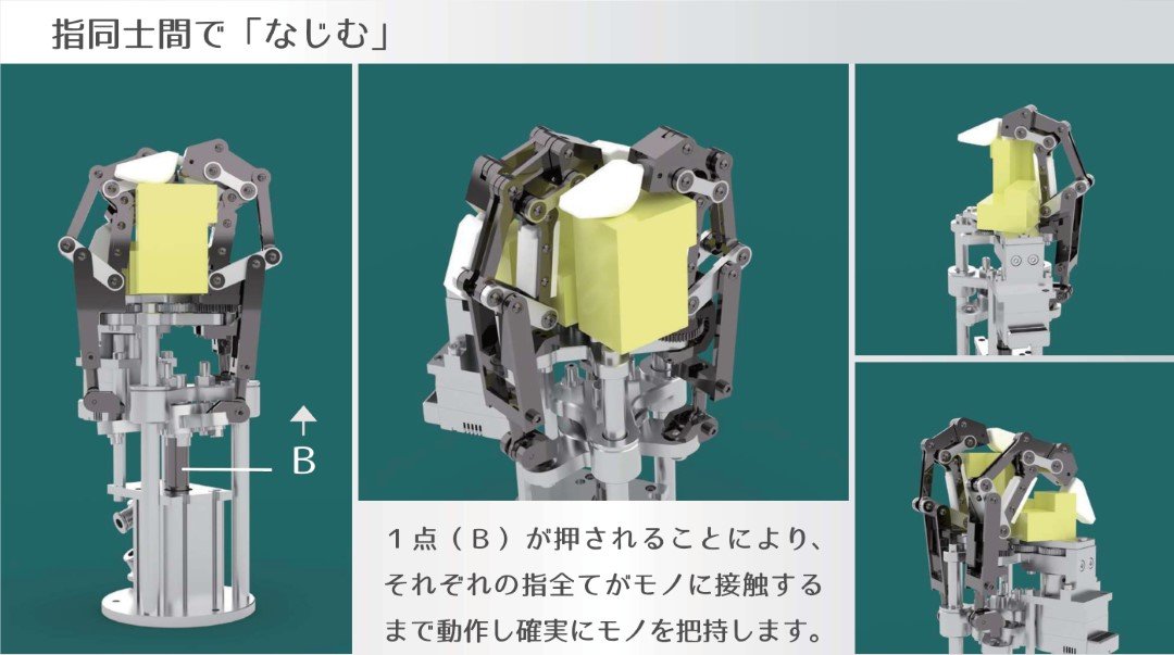 このからくり機構は、人間の手や指の微妙な構造を分析し、工学的に模倣した独自の構造で、最小限の力で、安定的に、かつ優しく物をつかむことを実現しています。