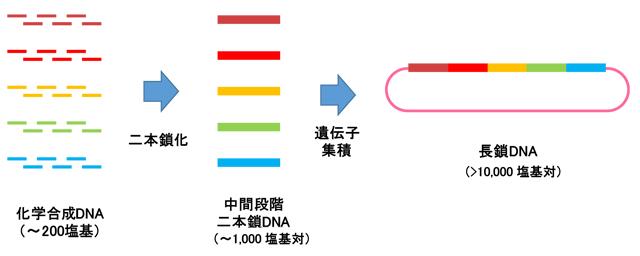 有用物質を生産するためには微生物の細胞内に新規の代謝経路を構築しますが、その際には多数の遺伝子を導入する必要があり、そのためには、任意の配列の長鎖DNA(10,000塩基より大きい)を構築する技術が必要です。任意配列のDNA合成のためには、化学的に合成したDNA(化学合成DNA)を出発材料とする必要がありますが、最大でも一度に200塩基程度の一本鎖DNAしか合成できません。