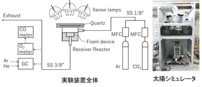これは反応性物質として酸素を吸蔵・放出する特性を持つセリア(CeO2)および新たにヘルシナイト(FeAl2O4)を用いて独自技術でフォームデバイス(多数の「空隙(くうげき)」を有する発泡体)を高温焼成し、太陽光を集光して照射することで酸化還元反応を起こし、炭酸ガスを酸素と一酸化炭素に分離することに成功したものです。