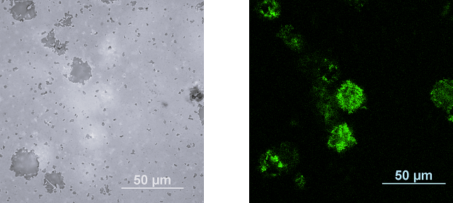 左図と同じ箇所を、レーザーを用いた蛍光顕微鏡で観察した、表面から約3µm下の蛍光像(右)