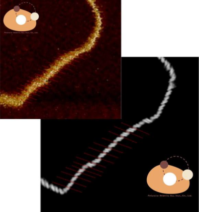 DNA二重らせんを用いた例では、直径約2nmのDNAはAFM画像(茶色)では直径約8nmの分子として観測されます。この画像をAI超解像生成システムに入力するとノイズのない明瞭なDNA二重らせん画像(白黒)を得ることができます。生成されたDNA二重らせん画像では主溝だけでなく副溝まで観察することができます(特開2025-085052) 。